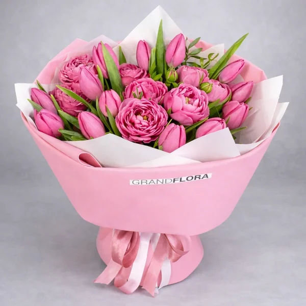 Любимые моменты – букет с розовыми кустовыми розами и тюльпанами